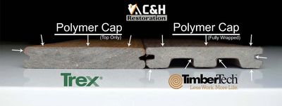 If you look at the edge of a composite deck board you’ll see that it’s made up of two parts. The core or inside part and the thin outer shell as shown in the close up pic above. In industry terms that thin protective outer shell is called the cap. Also referred to as a deck boards capping. Think of it as the hard chocolate shell of an ice cream bar. Both companies have this protective outer shell which is a coating of durable material that resists mold, staining, scratches and fading. Capping significantly prolongs the life of composite decking in both Azek and Trex.